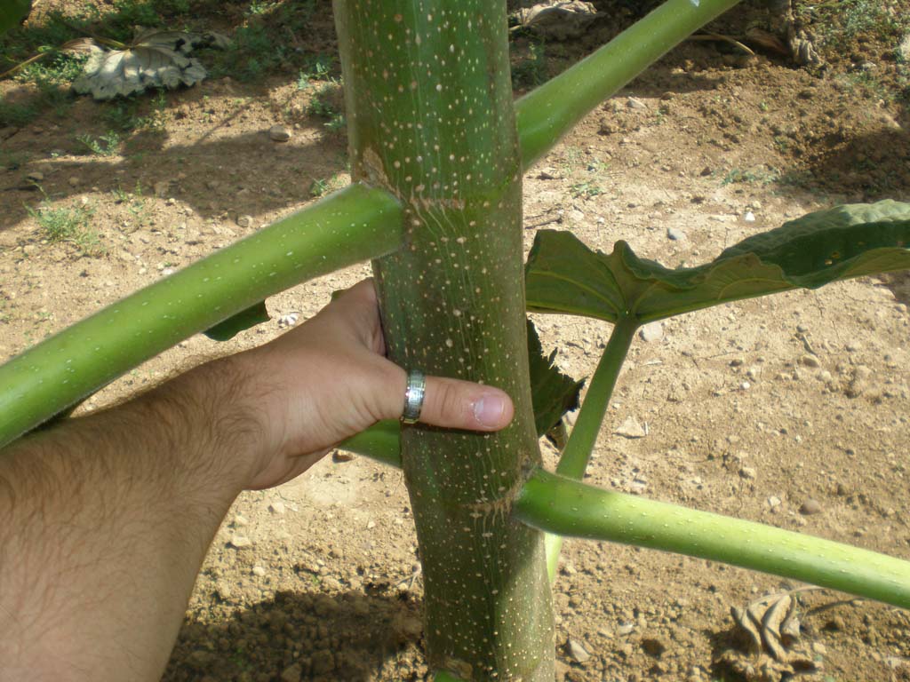 Paulownia Clon In Vitro 112®. Tronco jóven, aún con hojas. Observa que lo que se ven no son ramas, sino LOS PECIOLOS DE LAS HOJAS.
