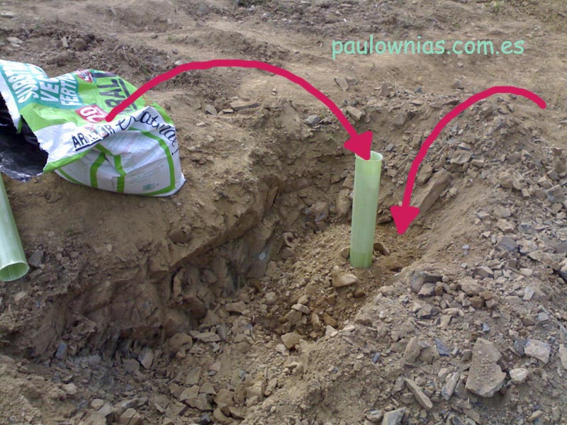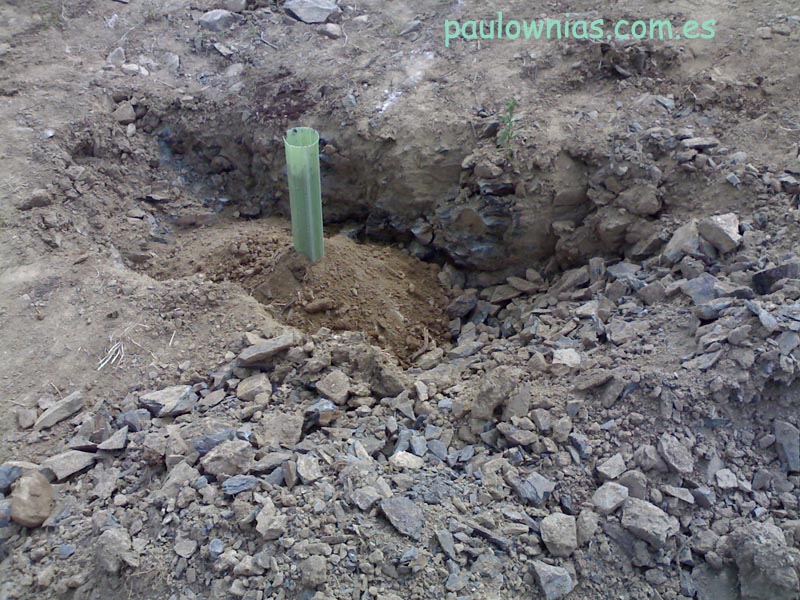 La ventaja de este sistema es que la base del cepellón se apoya sobre un canal vertical de tierra suelta y fértil, donde las raíces alcanzan con mayor rapidez una profundidad en la que la humedad se mantiene más tiempo entre riegos. A partir de ahí, las raíces tendrán las mismas desventajas que unas hipotéticas paulownias que se hubiesen plantado al lado sin utilizar mi sistema. En mi caso, de suelo poco profundo y base de roca pizarrosa, consideré necesario darle esa ventaja, pues según los lugareños, allí la arboleda sobrevive a base de introducir las raíces en las grietas que hay en las pizarras, y eso lleva su tiempo. Como vivo a gran distancia, no podía arriesgarme a que la sequía de la capa superficial entre riegos (recuerdo que las macetas sólo tenían 9 cm. de altura y se plantan a ras del suelo para evitar podredumbres de cuello) se diese antes de que las raíces hubiesen crecido ya fuera del cepellón y ganado profundidad suficiente o grietas húmedas.